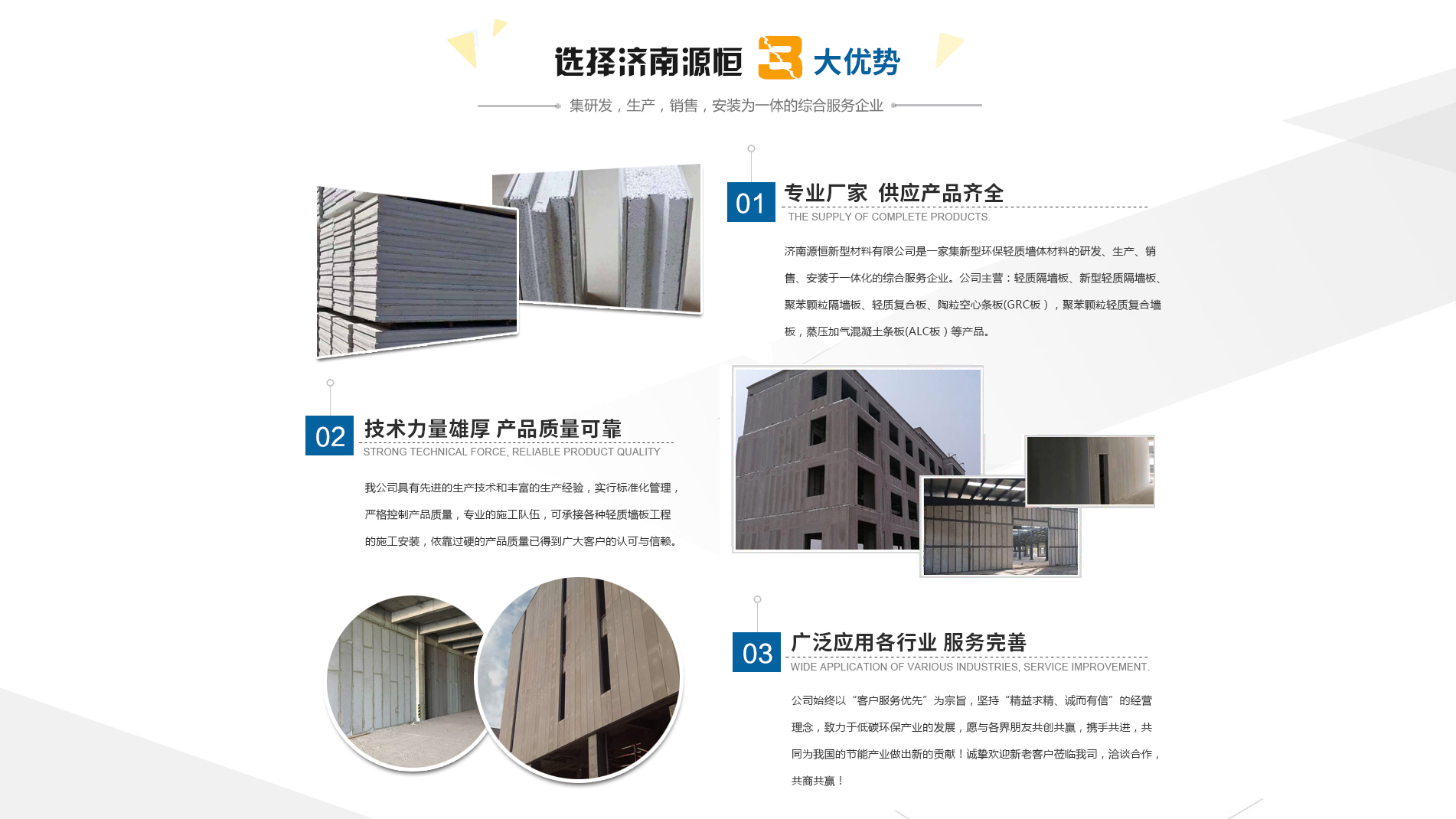 濟(jì)南源恒新型材料有限公司坐落于美麗的泉城濟(jì)南,是集新型環(huán)保輕質(zhì)墻體材料的研發(fā)、生產(chǎn)、銷(xiāo)售、安裝于一體化的綜合服務(wù)企業(yè)。我公司具有的生產(chǎn)技術(shù)和豐富的生產(chǎn)經(jīng)驗(yàn),為您提供輕質(zhì)隔墻板、新型輕質(zhì)隔墻板、聚苯顆粒隔墻板、輕質(zhì)復(fù)合板、陶粒空心條板(GRC板),聚苯顆粒輕質(zhì)復(fù)合墻板,蒸壓加氣混凝土條板(ALC板)等產(chǎn)品,本公司有專的施工隊(duì)伍,可承接各種輕質(zhì)墻板工程的施工安裝。輕質(zhì)隔墻板是國(guó)家推廣使用的新型輕質(zhì)、綠色無(wú)害建材,是墻改節(jié)能政策大力扶持的環(huán)保節(jié)能產(chǎn)品,是發(fā)達(dá)國(guó)家普遍采用的新型墻體材料。濟(jì)南源恒新型材料有限公司實(shí)行標(biāo)準(zhǔn)化管理,嚴(yán)格控制產(chǎn)品質(zhì)量,依靠過(guò)硬的產(chǎn)品質(zhì)量已得到廣大客戶的認(rèn)可與信賴。公司產(chǎn)品遍布各大城市,與國(guó)內(nèi)多家客戶建立了良好的合作關(guān)系。公司始終以“客戶服務(wù)優(yōu)先”為宗旨,堅(jiān)持“精益求精、誠(chéng)而有信”的經(jīng)營(yíng)理念,致力于低碳環(huán)保產(chǎn)業(yè)的發(fā)展,愿與各界朋友共創(chuàng)共贏,攜手共進(jìn),共同為我國(guó)的節(jié)能產(chǎn)業(yè)做出新的...